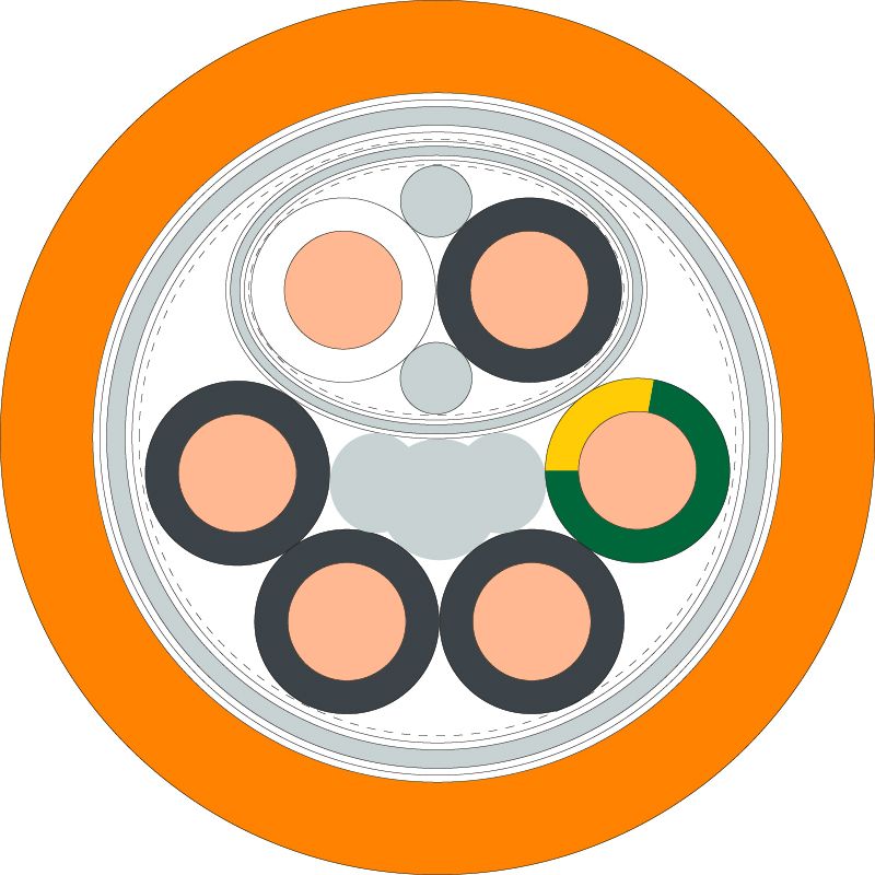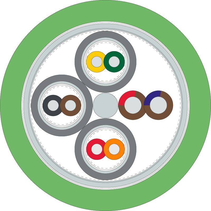 Verseilung | 4 Versorgungsadern mit einem geschirmten Bremspaar (nur bei Bedarf) um einen zentralen Kernfüller verseilt |