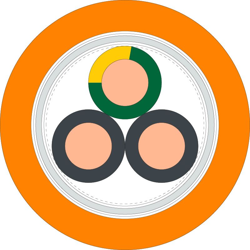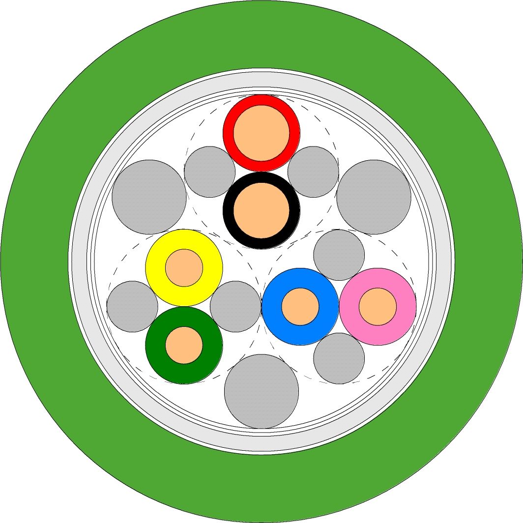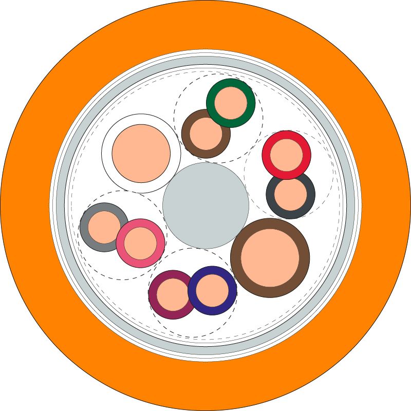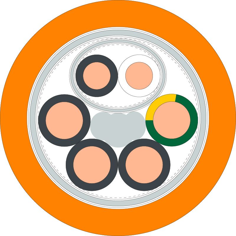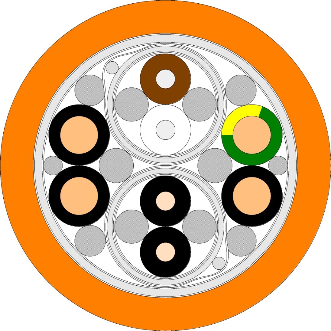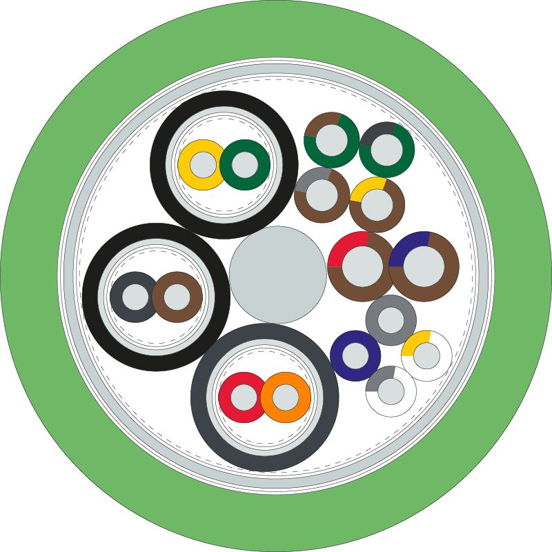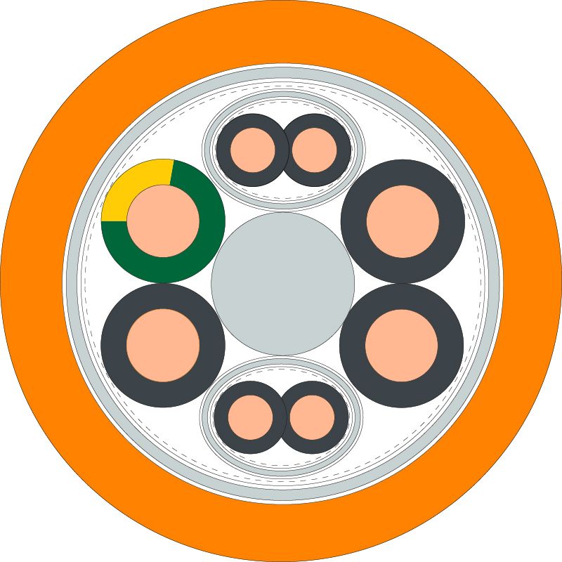 | Verseilung | 4 Versorgungsadern mit einem geschirmten Bremspaar (nur bei Bedarf) um einen zentralen Kernfüller verseilt |
